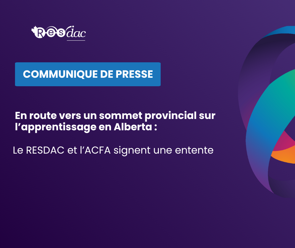 MARDI 28 OCTOBRE 2025 – Le RESDAC et l’ACFA sont heureux d’annoncer la signature d’une entente de collaboration en vue de l’organisation d’un sommet sur l’apprentissage en Alberta.